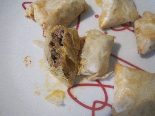 Coloque 1-2 cucharadas de carne molida en diagonal y dóblelas en trozos pequeños.