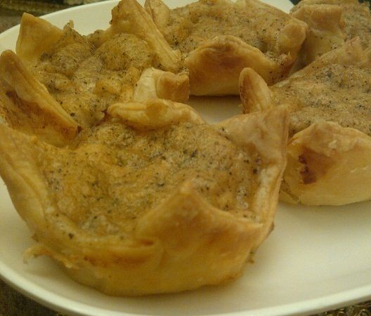 Cortar las láminas de hojaldre en 4 cuadrados y forrar un molde para muffins.