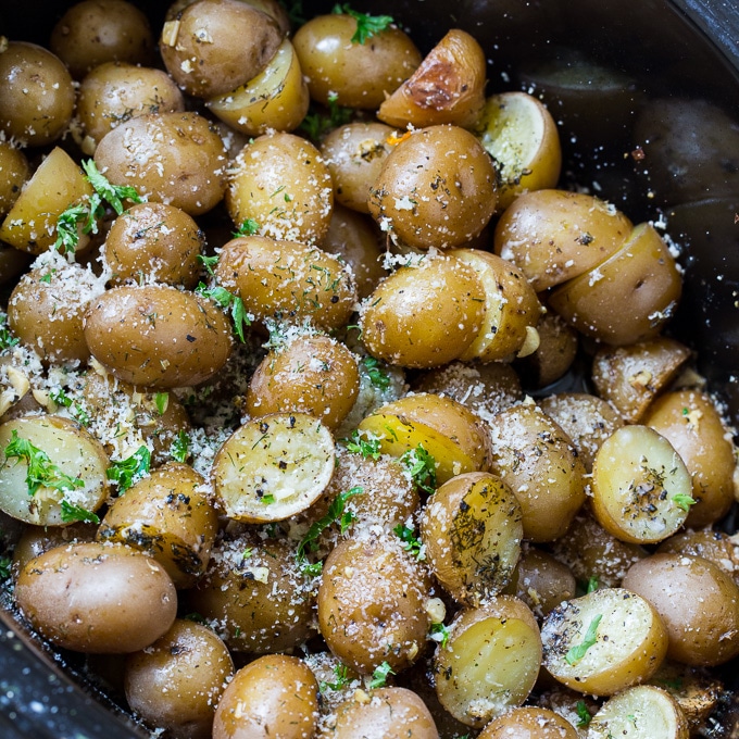 Para hacer estas papas con ajo y parmesano de cocción lenta, necesita alrededor de 3 libras de papas Yukon Gold pequeñas o rojas. Cortar el más grande por la mitad. Los pequeños pueden permanecer enteros.