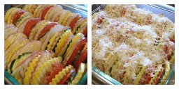 - Picar finamente la calabaza amarilla, el calabacín, la patata roja y los tomates Roma a mano o con una mandolina. Coloque alternativamente en la sartén encima de las cebollas.