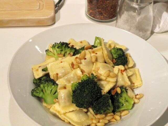 Agrega los ravioles, el br贸coli y los pi帽ones y sazona con sal.