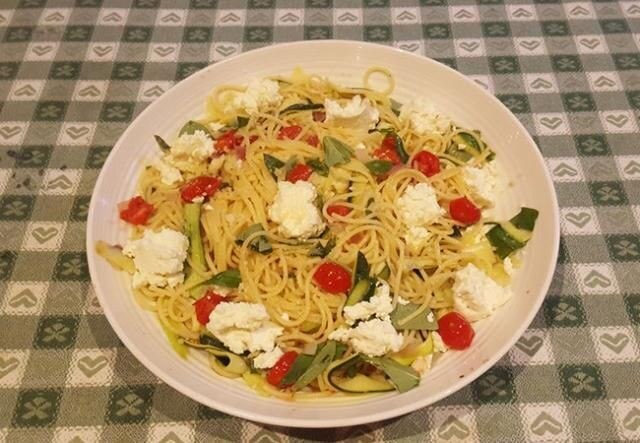 - 2 calabacines, rallados en trozos largos y cortados por la mitad
