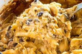- Agregue la salsa para tacos, la salsa y la crema agria hasta que se mezclen. Agregue frijoles negros y queso. Agregue los fideos de huevo cocidos. Si usa una fuente para horno, transfiera la fuente al horno con queso adicional, si lo desea, y cocine durante 10-15 minutos hasta que esté caliente y burbujeante. Si no tiene una fuente apta para horno, transfiera la mezcla de masa a una fuente de 9 × 13 pulgadas y cocine como se indicó anteriormente.