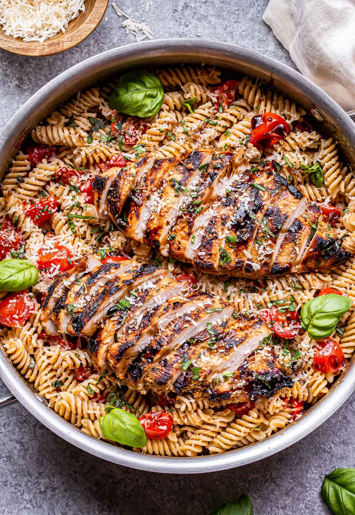 ¡La pasta de tomate y albahaca con pollo balsámico a la parrilla es una receta de pasta ligera y fresca perfecta para el verano! Un maridaje clásico con el agregado de un sabroso pollo marinado y a la parrilla. ¡Una cena fácil durante la semana!