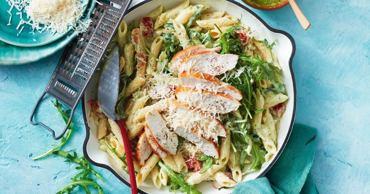 Mientras tanto, caliente el resto del aceite en la sartén a fuego medio-alto. Añadir la cebolla y el ajo. Cocine, revolviendo, durante 2 minutos o hasta que se ablande. Agregue la harina. Cocine, revolviendo, durante 1 minuto o hasta que esté cubierto. Añadir existencias. Llevar a ebullición, revolviendo. Reducir el calor al mínimo. Agrega la crema. Hervir de 2 a 3 minutos o hasta que espese un poco. Retire la sartén del fuego. Agregar el tomate, el pesto, la rúcula, la pasta y el agua de cocción reservada. Condimentar con sal y pimienta. Cortar el pollo en rodajas finas. Agregue 3/4 del pollo a la masa. Cubrir la masa con el resto del pollo y el queso parmesano. Atender.