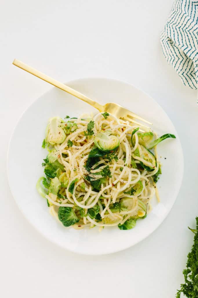 Pero cuando la masa está así, ¿cómo resistirse? Hoy estoy compartiendo una pasta simple de 5 ingredientes con apio en espiral (también conocido como raíz de apio), coles de Bruselas, ajo, pimienta y sustituto de mantequilla Earth Balance.