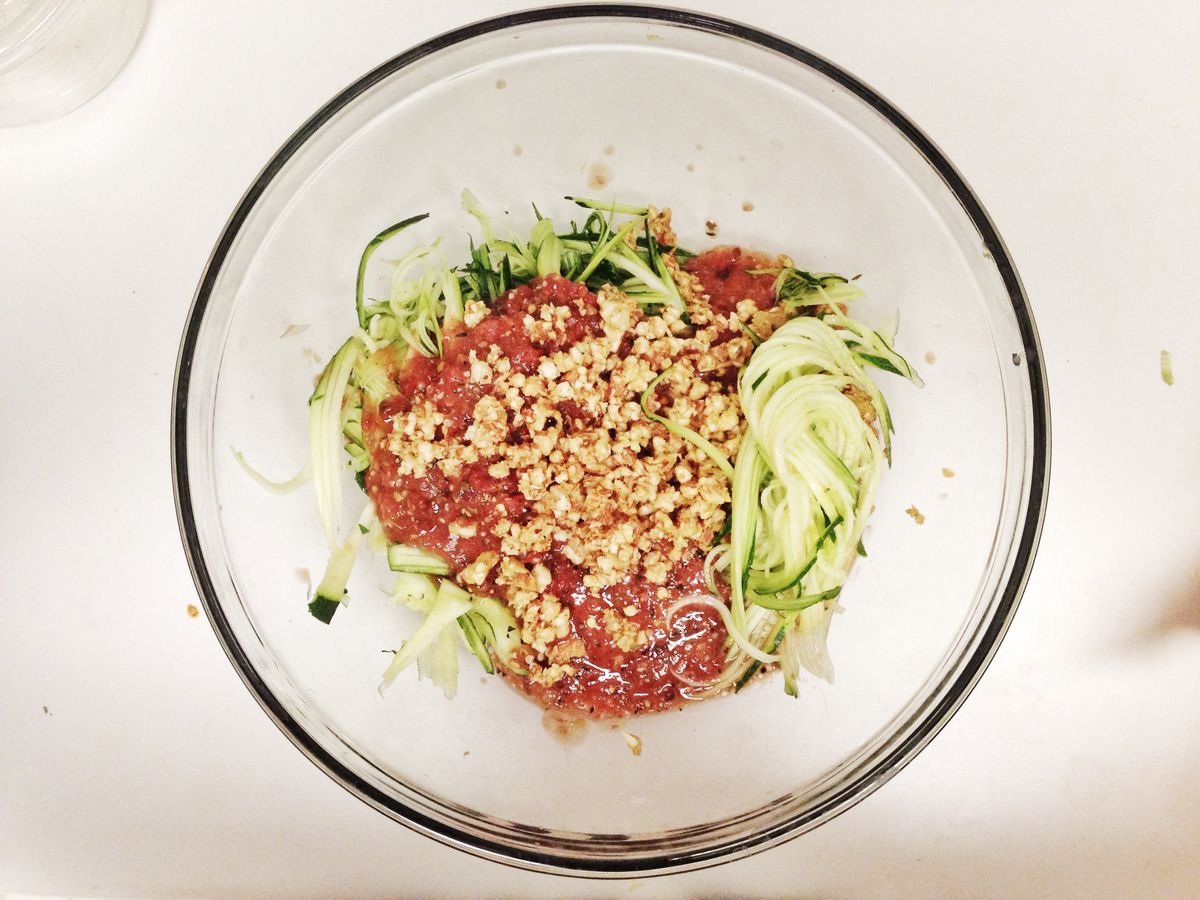 Agregue los tomates secados al sol, los tomates picados, el ajo, las hierbas y las hojuelas de pimiento rojo (si se agregan) a un procesador de alimentos y mezcle en una licuadora. Sazone con sal y pimienta al gusto. Agregue la “masa” de calabacín al tazón