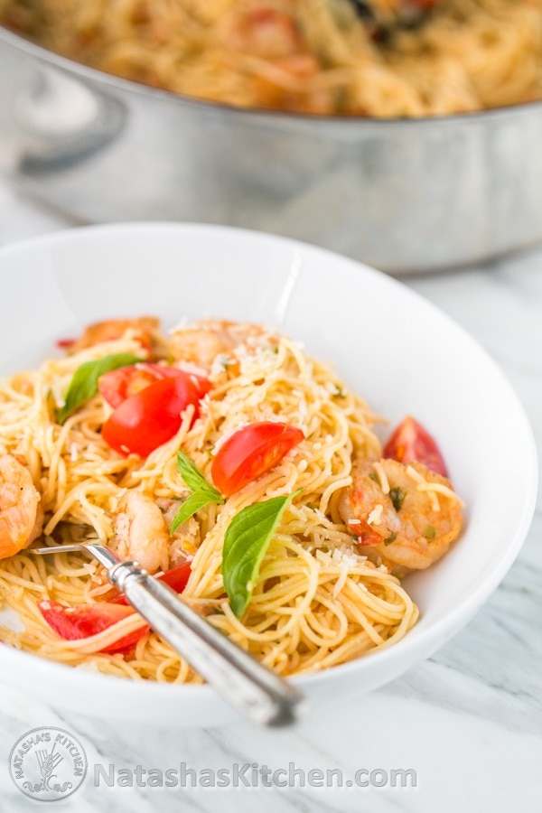 Me encanta una buena comida de 30 minutos, ¡y aparentemente a ti también! Esta receta de pasta con camarones ha sido locamente fijada y compartida (¡gracias de todos modos!). Es fácilmente una de las recetas más populares en mi blog. La masa es cremosa pero liviana (¡con solo 1/2 taza de crema!) Y está rellena de camarones suculentos y carnosos.
