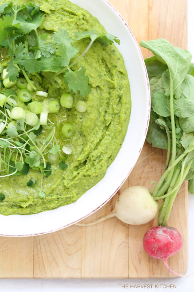 Este hummus verde vibrante tiene un sabor ligeramente picante debido a la microrúcula que agregué a la mezcla. El micro cohete es un “micro verde”. Los microgreens de una variedad de 25 vegetales diferentes contenían concentraciones más altas de vitaminas y carotenoides que sus contrapartes completamente desarrolladas. Algunos estudios sugieren que es de 4 a 6 veces la cantidad. Los microgreens son más suaves que los maduros pero tienen el mismo sabor. Los microgreens se cultivan en el suelo, lo que aumenta sus nutrientes beneficiosos, y se cosechan entre 7 y 14 días después de la germinación. A diferencia de los microgreens, los brotes se cultivan en agua.