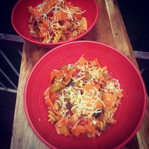 Caliente el aceite en una sartén grande a fuego medio. Agregue la berenjena, la cebolla, el ajo, el jengibre, el apio y cocine por unos minutos hasta que las berenjenas comiencen a dorarse y ablandarse. Agregue el romero y el tomillo y mezcle, luego agregue los tomates, el caldo y los frijoles. Condimentar con sal y pimienta. Luego lleve a ebullición, reduzca el fuego a bajo y cocine sin tapar durante 10-15 minutos hasta que la salsa se haya reducido, revolviendo ocasionalmente.