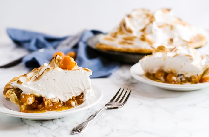 La fruta es firme y llena de semillas, muy parecidas a un tomate, pero son dulces, con un ligero sabor agrio. El sabor exacto es difícil de describir porque es único, pero me encanta combinarlo con limones Meyer. Y como anhelaba un pastel relleno de merengue, esta parecía la oportunidad perfecta. Echa un vistazo a todo ese merengue de malvavisco encima de este pastel de grosella. ¡Esto es espectacular!