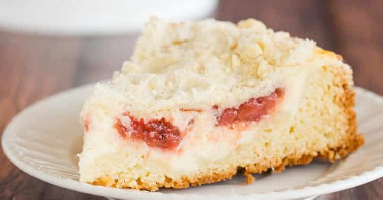 Este fabuloso pastel de café tiene una textura similar a la de una galleta, junto con un relleno rápido y fácil de mermelada de ruibarbo de fresa y queso crema… ¡un postre o brunch perfecto para la primavera!