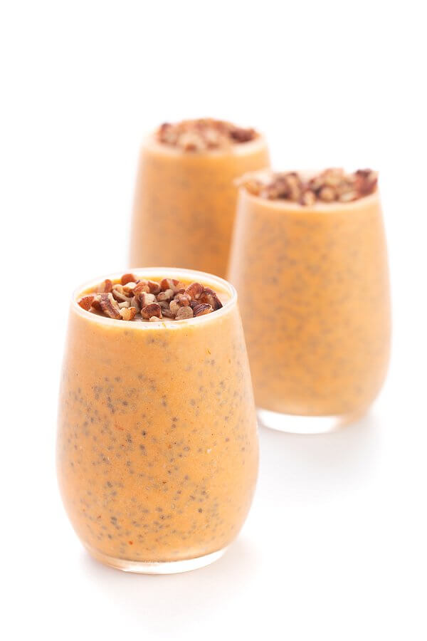 Con la temporada de calabaza oficialmente aquí, decidí crear una versión de pastel de calabaza con pudín de semillas de chía, preparando calabaza pura, jarabe de arce y especias calientes como canela y jengibre.