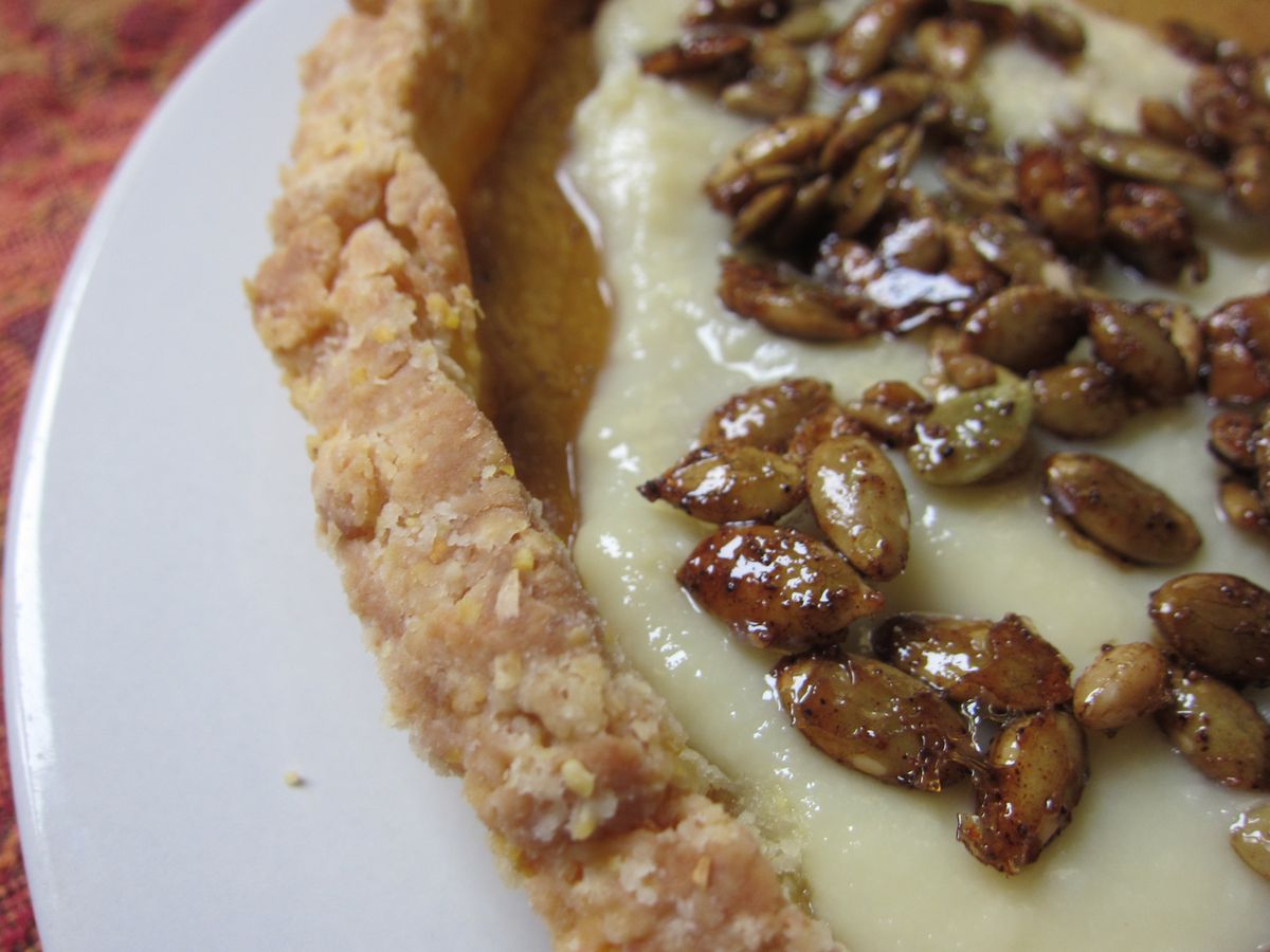 El pastel de calabaza definitivamente está entre mis 10 pasteles favoritos (¡porque sí, tengo una lista!) Y, por supuesto, ya es adorado como un pastel de Acción de Gracias. Pero me preguntaba cómo hacer un pastel de calabaza que enfatice la festividad y honre los sabores de las Américas, hogar de la calabaza. Los ingredientes de este pastel son como los mayores éxitos de los sabores nativos americanos: la masa crujiente de la harina de maíz, una explosión de bourbon de maíz americano en el dulce de leche latinoamericano, nuggets rociados con pimienta de Jamaica y pimienta de cayena y, por supuesto, una rica y esponjosa crema de calabaza en el medio. —Vrunka