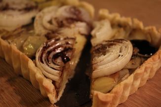 Inspirado en una de las recetas de Martha Stewart, este delicioso pastel salado es uno de mis favoritos. Combina el delicado sabor de las papas finas de mandolina con el sabor perfectamente dominante de las cebollas dulces, junto con una llovizna de glaseado de reducción balsámica. Espolvoreado con tomillo de limón fresco, este es el acompañamiento perfecto para cualquier comida. Por supuesto, se puede utilizar cualquier variación de verduras. -tutusandcha