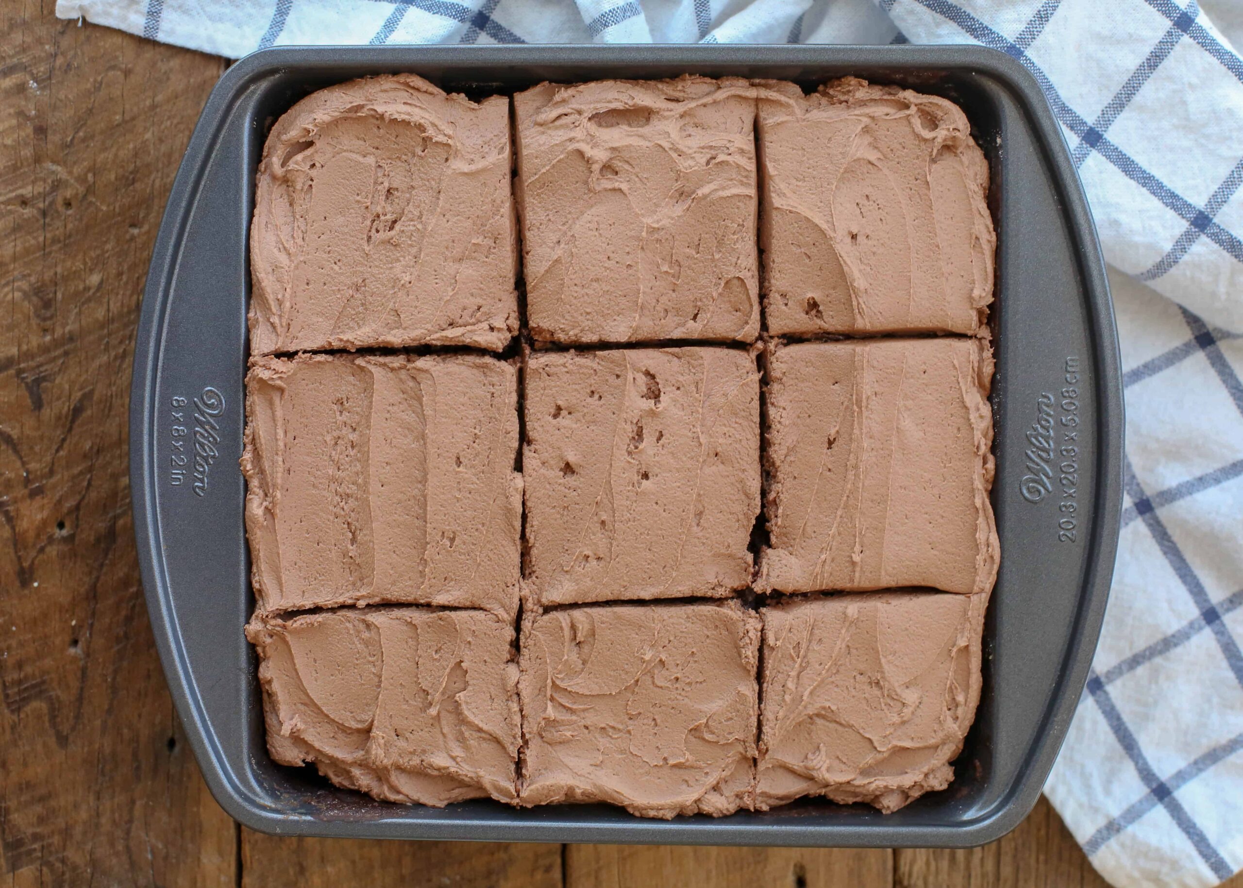 Para hacerlo un poco más elegante, elegí cubrir el pastel con mi glaseado de chocolate Fluffy favorito. Si necesita un glaseado sin lácteos o un pastel vegano, este glaseado rico en chocolate vegano o este glaseado de crema de arce vegano serían perfectos para ello.