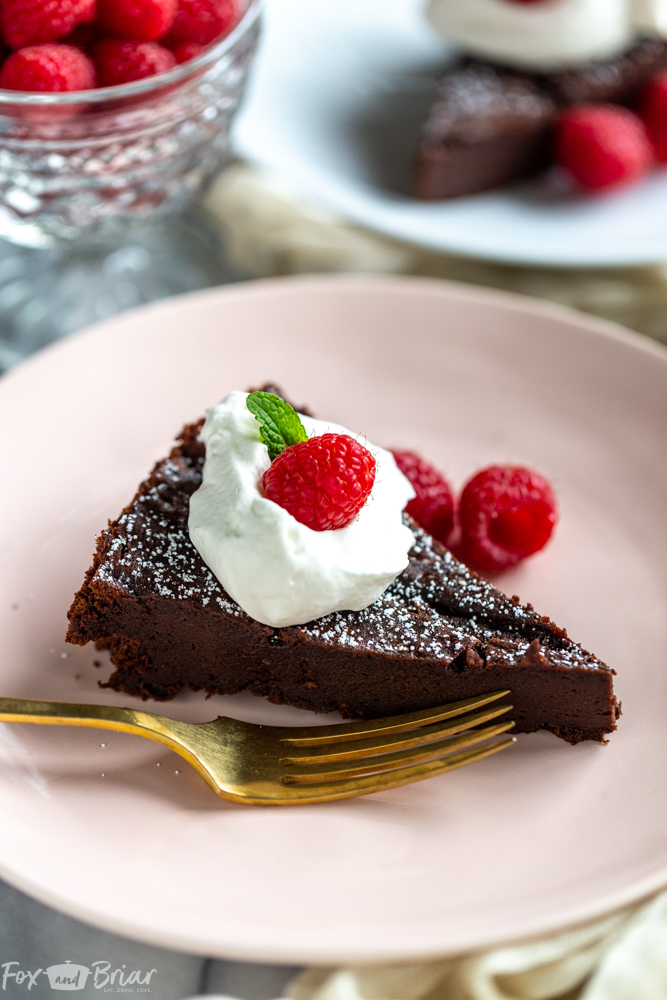 Este pastel de chocolate sin harina tiene mantequilla, chocolate amargo, huevos, azúcar, extracto de vainilla y una pizca de sal kosher. Debido a que la lista de ingredientes es tan corta, es importante usar chocolate de alta calidad.