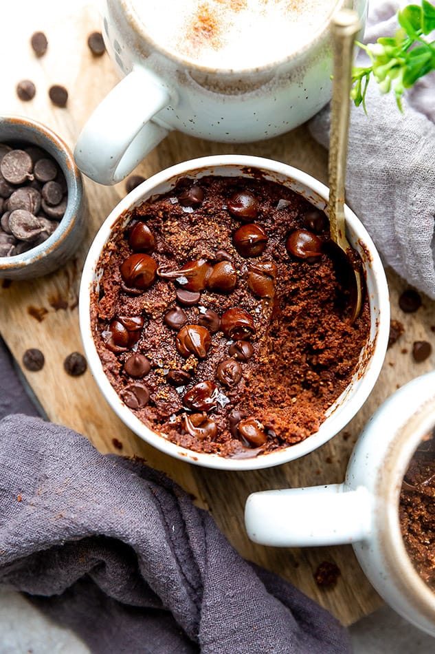 Este pastel de chocolate se hornea suave, dulce y delicioso en un minuto en el microondas con simples puntos de despensa. ¡Es el pastel paleo vegano bajo en carbohidratos perfecto que satisfará cualquier antojo dulce!