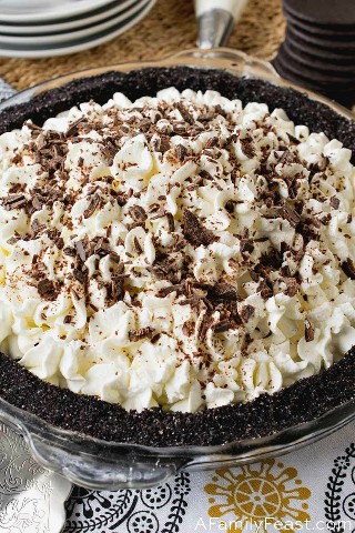 ¿Quién puede culpar a tus invitados a la cena? Este rico y cremoso pastel de chocolate tiene una corteza de galleta dulce con chispas de chocolate, cargada con un relleno de chocolate negro y luego cubierta con crema batida y chispas de chocolate. ¡Es celestial!