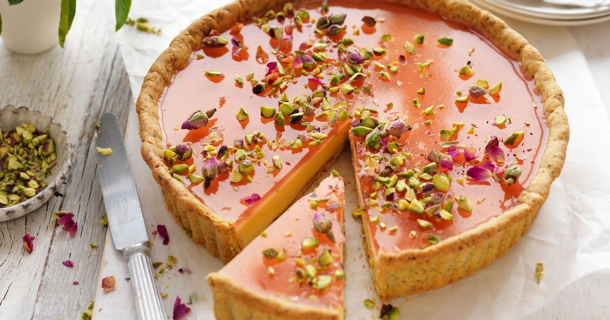 Procese los pistachos para obtener migas finas. Agregue la harina y el azúcar en polvo y trabaje para combinar. Agregue la mantequilla y pulse hasta que la mezcla parezca pan rallado. Agregar poco a poco suficiente agua hasta que la masa sea homogénea. Formar un disco, enrollar y refrigerar por 30 minutos.