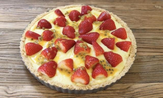 Pelar y cortar las fresas por la mitad y distribuirlas sobre la tarta. Espolvorear con la pulpa de maracuyá.