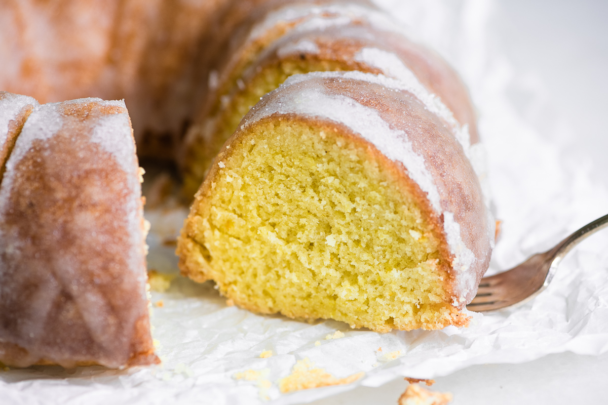 El pastel tiene un hermoso color dorado y cada vez que el cuchillo pasa a través de ese glaseado de limón crujiente, crea una textura crujiente agradable, por lo que no hay necesidad de campanas ni silbatos.