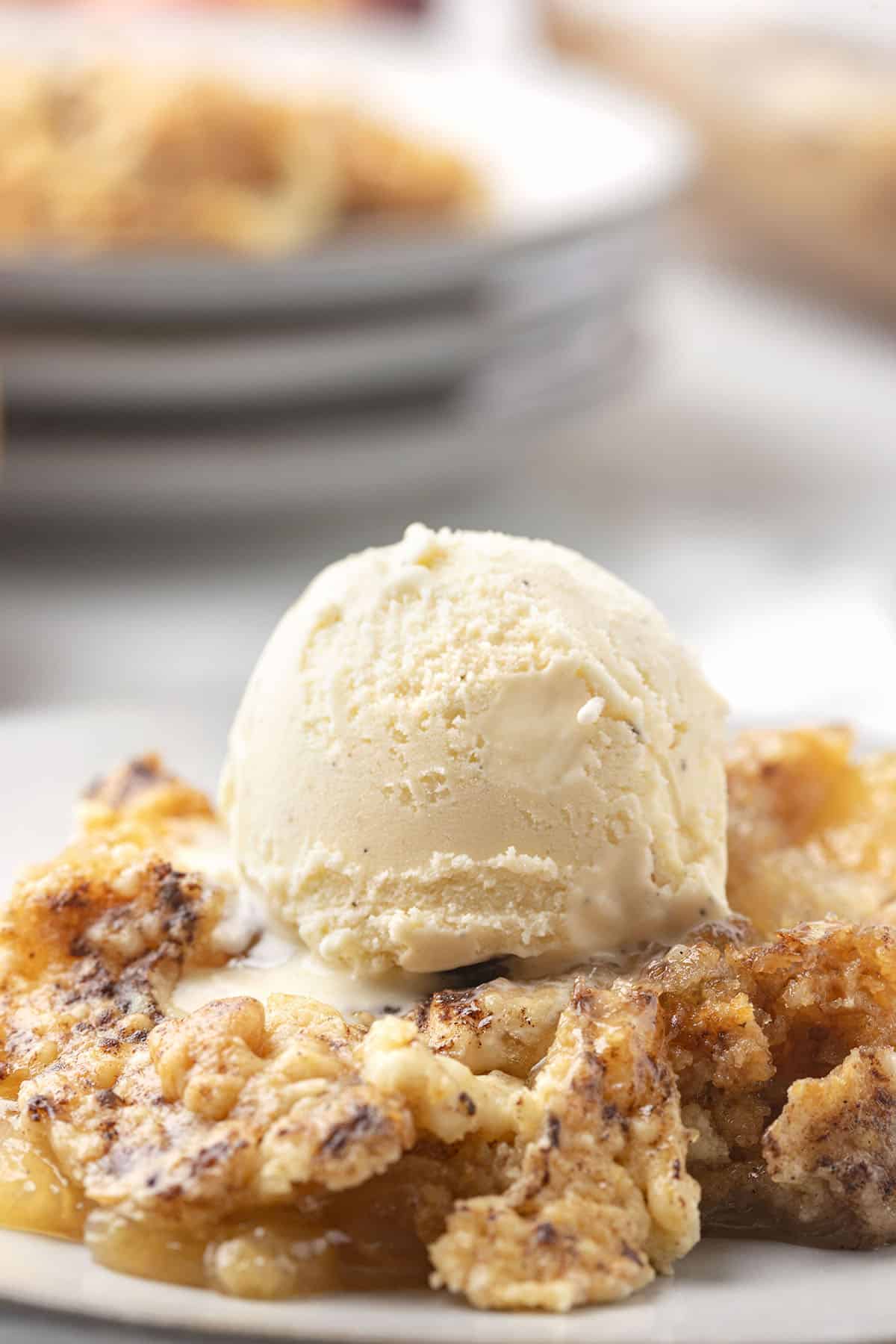 Apple Dump Cake es el pastel más fácil de preparar en un instante con solo cuatro ingredientes. ¡Este postre de manzana caliente y pegajoso se sirve perfectamente con una gran bola de helado!