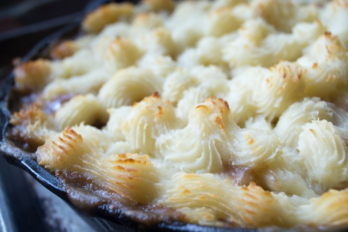 Hoy se me ocurre una receta sobre la que no tenía la intención de publicar en el blog: fue nuestra cena la otra noche y estaba tan buena que pensé en compartirla. Afortunadamente, tomé algunas fotos por costumbre. Este es un hermoso pastel de cordero al pastor con la sorpresa de coles de Bruselas, nabos y nabos en la mezcla. Cocino toda mi sartén en hierro fundido y la lleno con puré de papas enriquecido con buen queso cheddar irlandés. No se calienta ni se calienta más, y el sabor de las verduras otoñales más abundantes es un cambio agradable de las zanahorias y los guisantes.