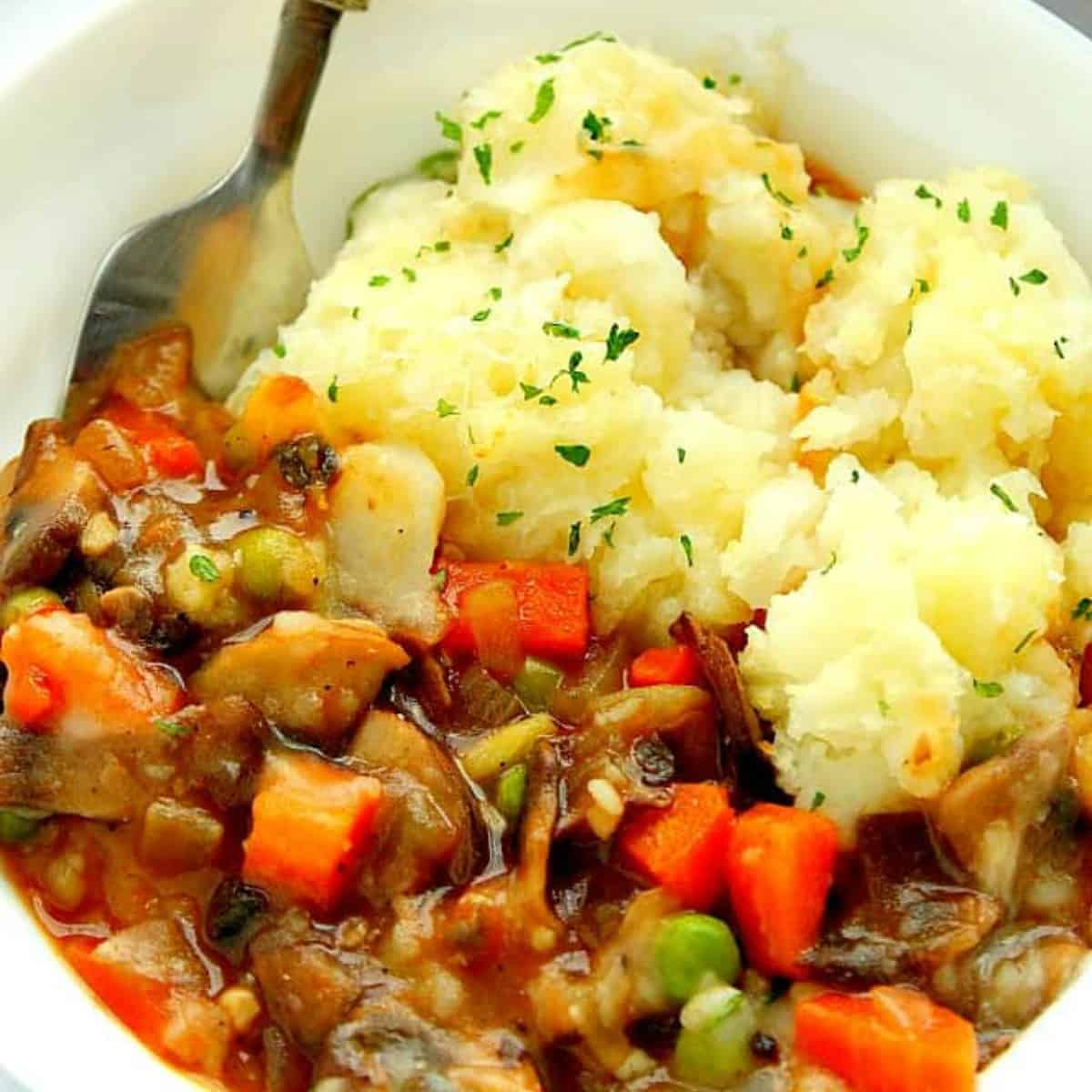 Una versión sin carne de un clásico plato británico/irlandés. La rica salsa de champiñones con verduras se cubre con puré de papas esponjoso y se hierve.