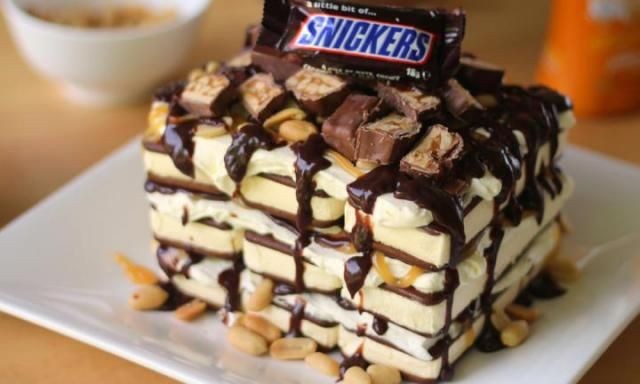 Repita dos veces hasta que tenga una pila de tres capas. Espolvorea barras de Snickers picadas encima y congela hasta que las necesites.