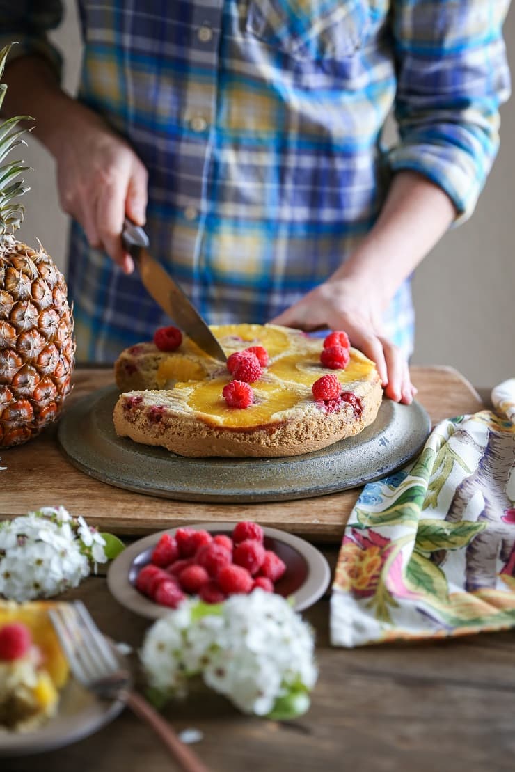 Basé esta receta en mi pastel de higos con harina de almendras, la principal diferencia es que usé rodajas frescas de piña y frambuesas para el relleno en lugar de los higos. Esta receta de pastel es su adicción a las drogas para todos los pasteles al revés… y los pasteles del lado derecho… y los pasteles en capas… amigos, ¡está TAN húmedo! Si eres intolerante a la harina de almendras, puedes seguir esta receta de pastel de vainilla Paleo, que requiere harina de coco (¡solo usa un molde para pasteles de 8 o 9 pulgadas en lugar de una bandeja para hornear)!