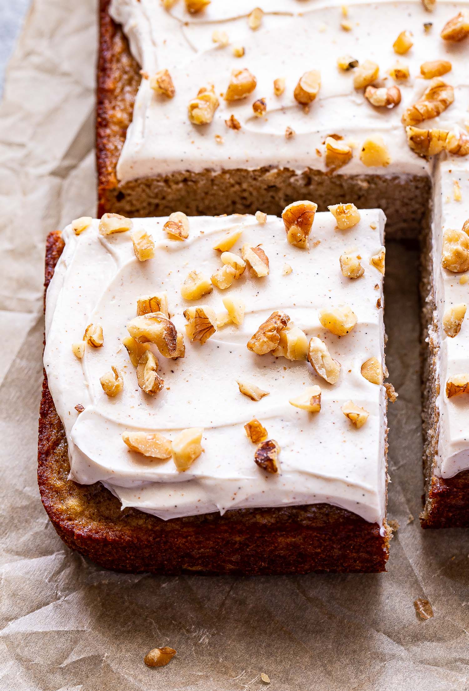 - Extienda el glaseado sobre el pastel de plátano enfriado. Cubra con nueces o nueces tostadas picadas, si lo desea.
