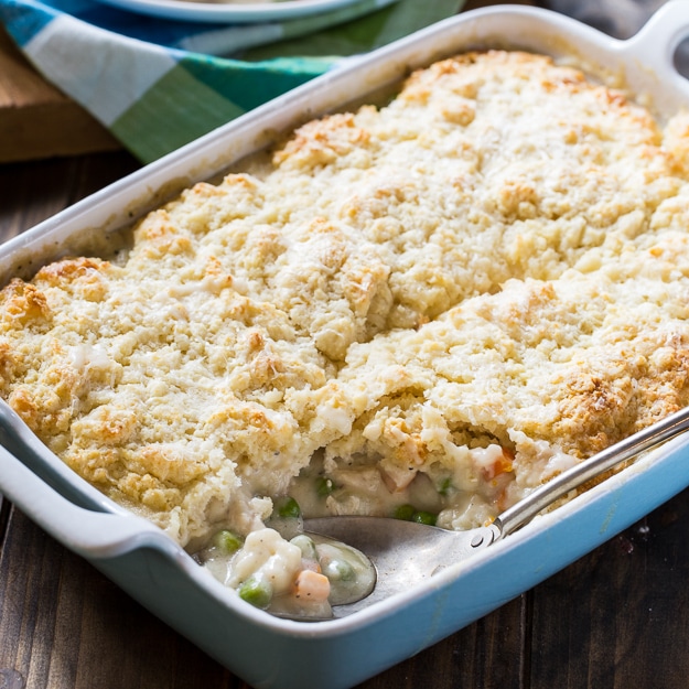El pastel de pollo con cobertura de galletas tiene un relleno cremoso con mucho pollo, guisantes y zanahorias y una cobertura ligera y esponjosa.
