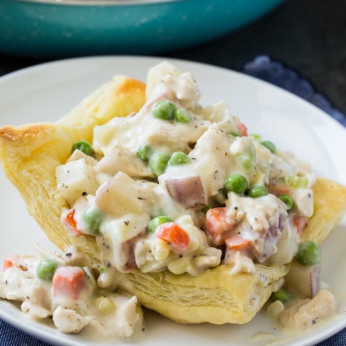 Chicken Pot Pie es una de mis comidas sureñas favoritas y particularmente me encanta esta versión que usa una masa de hojaldre para hacer un tazón en lugar de una corteza.