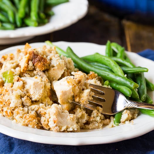 La cazuela de pollo rellena con trozos de carne blanca de pollo y una mezcla cremosa de relleno con cebolla, apio y champiñones es la comida perfecta para el otoño y es la comida adecuada para servir cuando no puede esperar a la comida de Acción de Gracias.