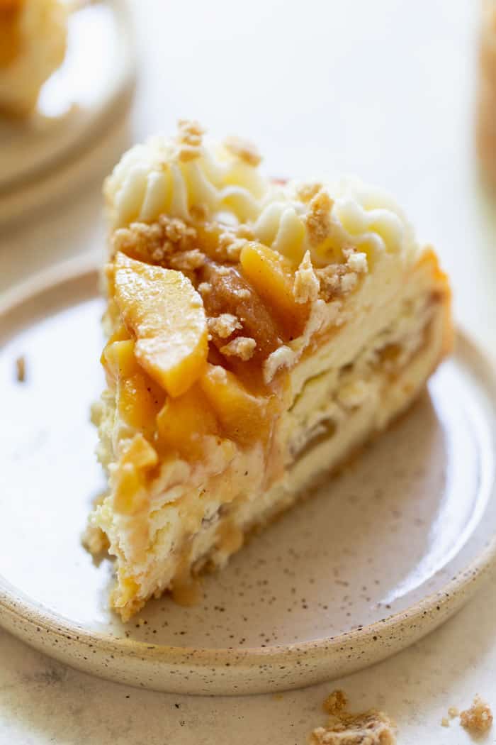 ¡Este pastel de queso con pastel de durazno combina los sabores clásicos de un pastel de queso crema al estilo de Nueva York con la decadencia de un pastel de durazno sureño relleno con duraznos caramelizados y una miga de mantequilla! Realmente es el postre decadente por excelencia. Si te encanta todo lo relacionado con el pastel de durazno, prueba mi Southern Peach Cobbler y mi Peach Cobbler Bread Pudding.