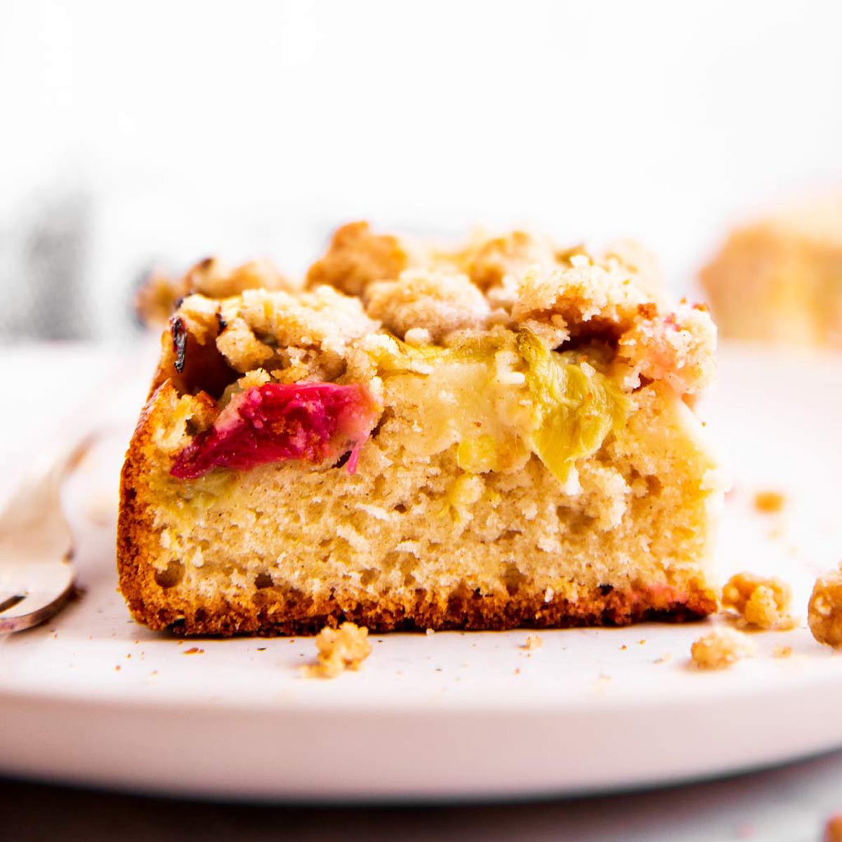 Una maravillosa receta de brunch de primavera: ruibarbo picante en un pastel de café esponjoso cubierto con mucho streusel.