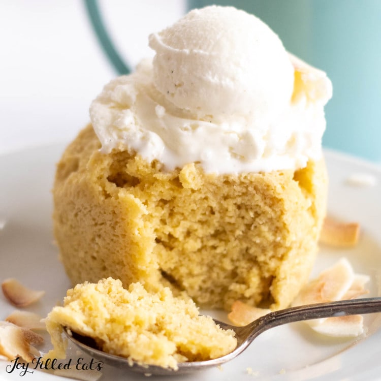 ¡El pastel de taza de harina de coco Keto es la mejor manera de hacer un postre para uno! ¡Con solo 4 carbohidratos netos, este es un gran postre bajo en carbohidratos sin azúcar!