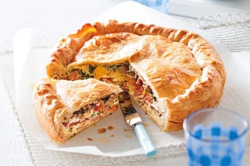 Cubra un molde para pastel o molde para pastel de 20-22 cm con papel pergamino, luego 1 hoja de masa. Pinchar la masa con un tenedor para dejar salir el aire.