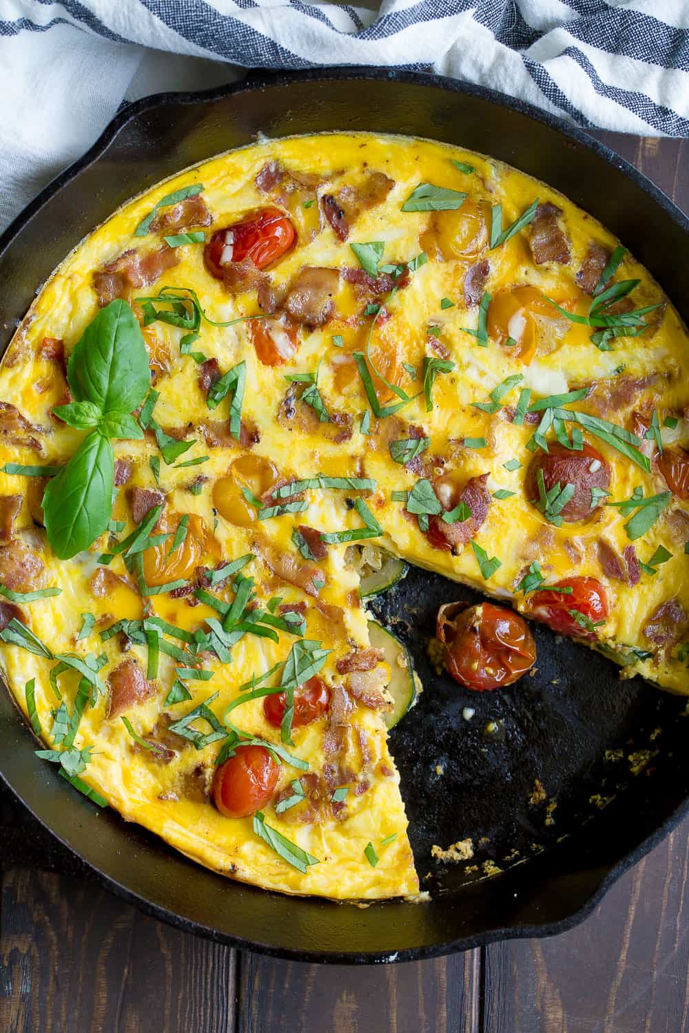 ¡Toma todas las mejores verduras de verano para crear este pastel de calabacín perfecto! Una deliciosa combinación de calabacín y tomate salteados con huevos, tocino, albahaca fresca y queso cheddar blanco opcional. ¡Un maravilloso brunch, desayuno, almuerzo e incluso cena!