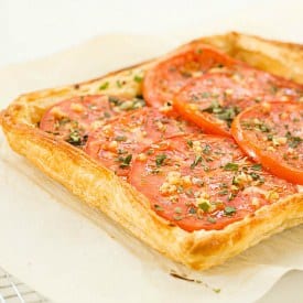 El hojaldre se cubre con queso parmesano y mozzarella, luego se cortan las rodajas de tomate y se rocÃan con ajo y aceite de oliva. Una vez horneado, el pastel se espolvorea con albahaca fresca. Esto serÃa perfecto para servir como brunch, almuerzo o aperitivo. Mi consultor culinario principal y yo lo compartimos para el almuerzo; Puedes hacer fácilmente una versión más grande combinando las dos hojas de hojaldre del paquete y duplicando todo lo demás en la receta.