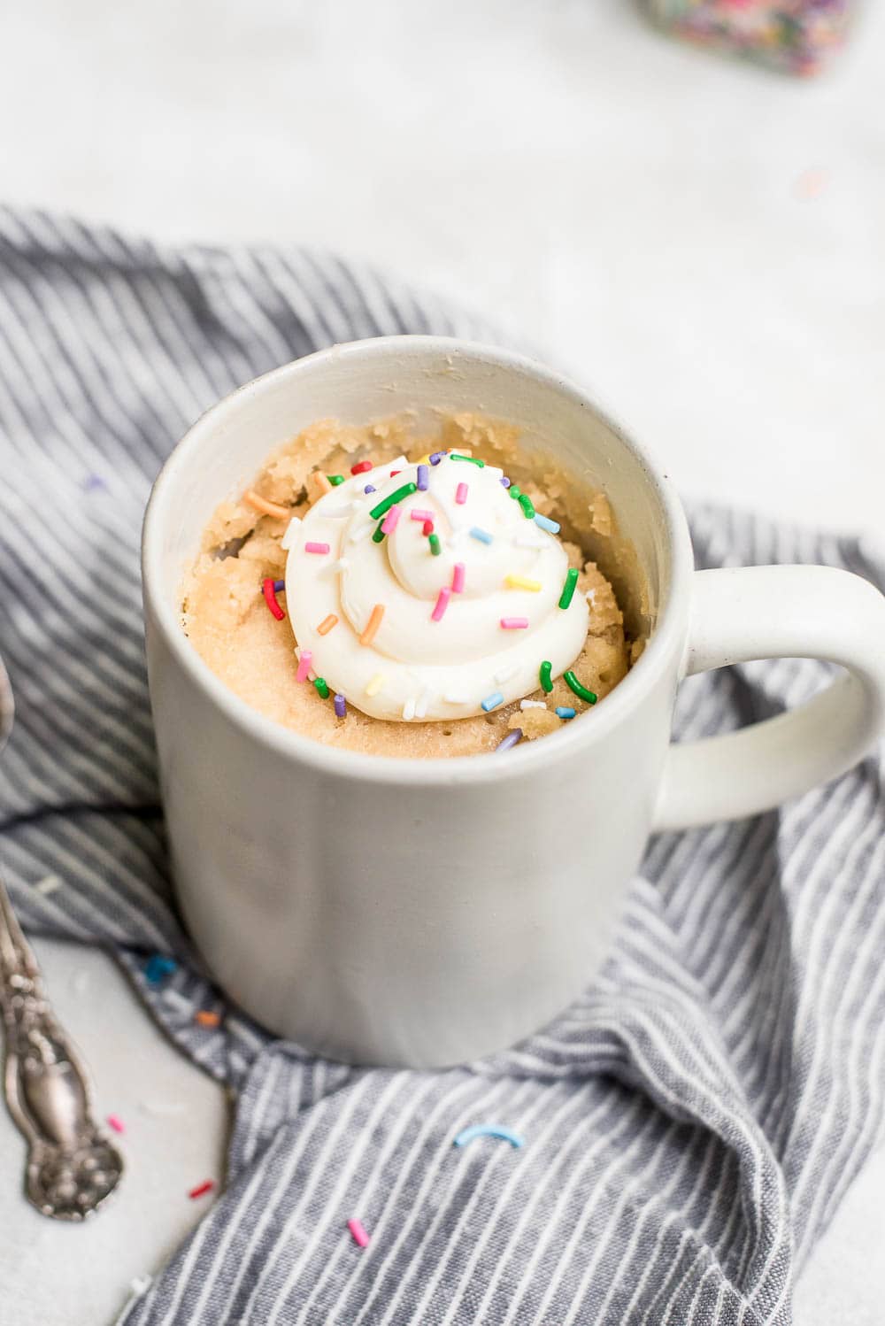 La mejor parte es que, dado que no estás glaseado como un pastel de capas, puedes comer el pastel de vainilla mientras aún está caliente. Me encanta agregar glaseado, crema batida o helado a mi pastel tibio de vainilla en una taza para que se derrita y cubra todo el pastel.