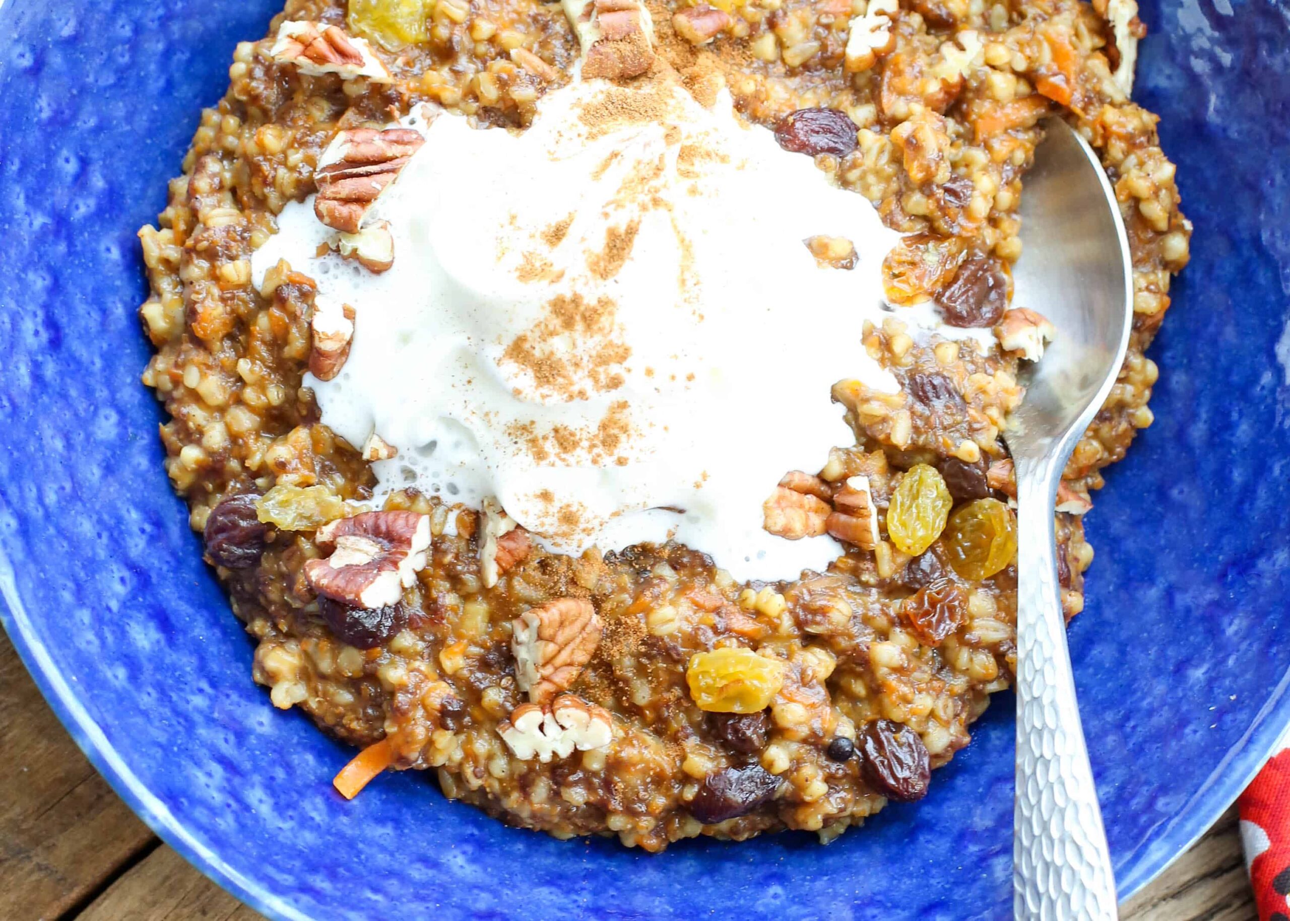 Esta receta de avena y pastel de zanahoria está hecha con avena cortada al acero y es más que fácil de hacer. Me encanta que puedas agregar todos los ingredientes a la olla a presión y luego listo. No se necesita quejarse ni cuidar niños. Esta avena está llena de especias, te llena lo suficiente como para mantenerte lleno hasta el almuerzo, y con una cucharada de crema batida encima, es una delicia para el desayuno. (¡Recomiendo esta crema batida también!)