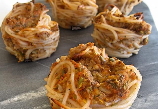 Usando pinzas, llene cada molde para muffins con la mezcla. Es posible que deba agregar más salsa a cada uno y mezclar suavemente con una cuchara.