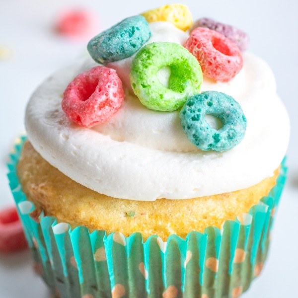 El cereal Froot Loops ha sido mi favorito desde que era niño y siempre tenemos una caja en la despensa. A todos en la casa les gusta un tazón para el desayuno, pero ¿y si pudieran tenerlo como postre? ¿Pastelitos para el desayuno? Probablemente no. cereales de postre? ¡Si, gracias! Estos cupcakes Froot Loop son una forma divertida de usar Froot Loops para algo más que el desayuno. Los cupcakes Froot Loops están rellenos de cereal crujiente y afrutado en esponjosos cupcakes dorados y cubiertos con mantequilla casera hecha con leche de cereales. También rellené un poco de crema de malvavisco en el medio para una dulce sorpresa ;).