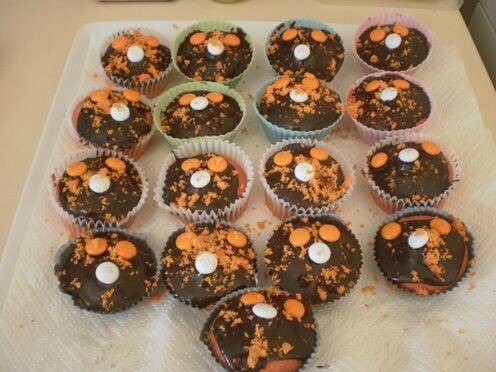 Vierta la masa en moldes pequeños para cupcakes, llenos hasta la mitad. Coloque un Malteser en cada cupcake, presionando hacia abajo.
