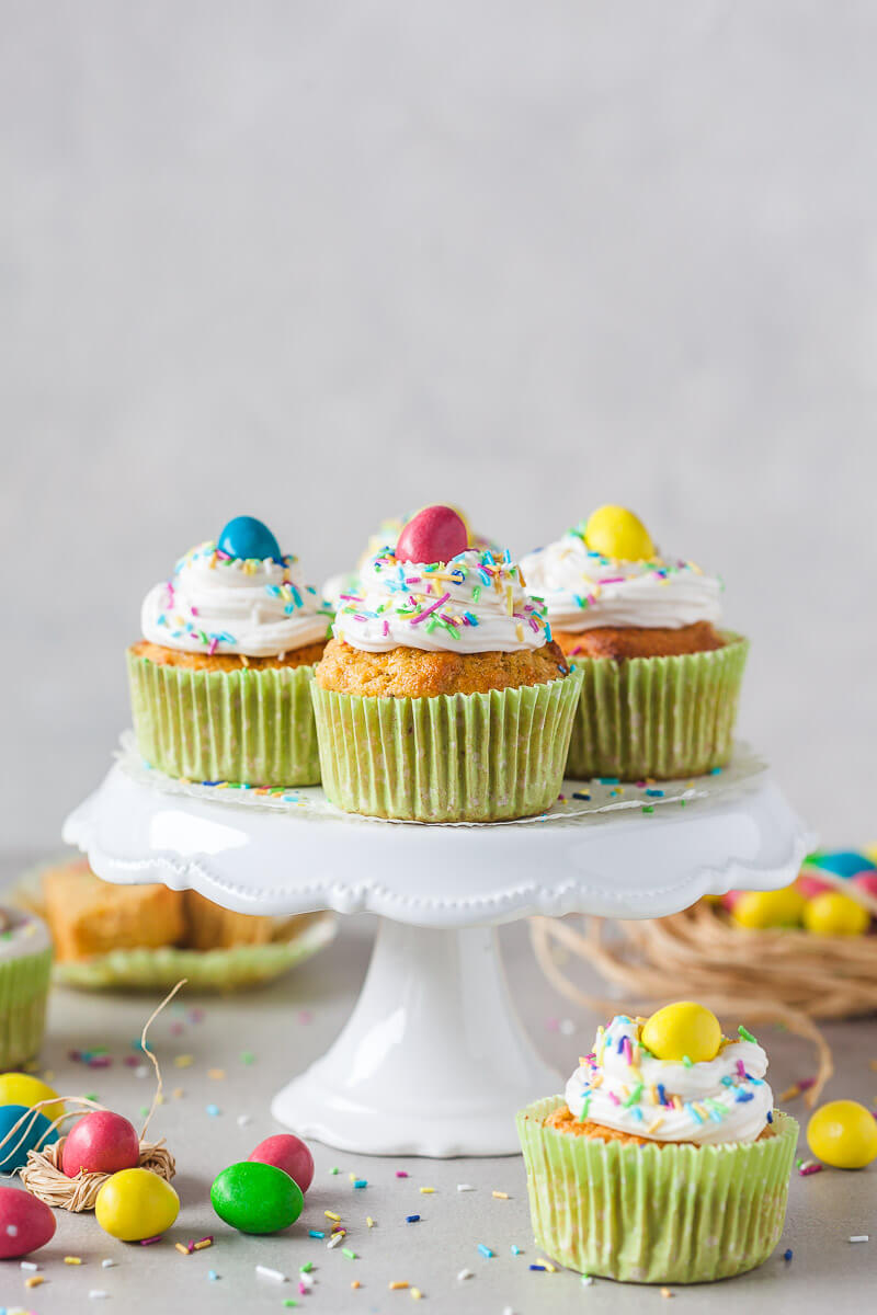 - Prepara los ingredientes y decora: Agrega una gota de extracto de vainilla a la crema de soya batida y bate de acuerdo con las instrucciones del paquete (la mía solo tomó 2 minutos). Coloque la crema batida en una bolsa y rocíe los cupcakes con la crema batida. Espolvoree las magdalenas con chispas de arcoíris y agregue un pequeño huevo de chocolate encima. Atender.