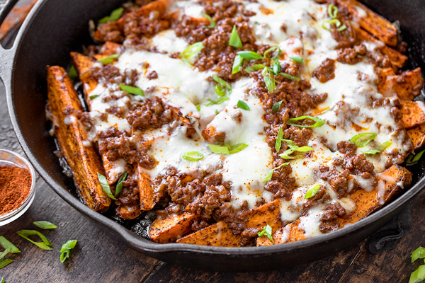 Estas papas fritas horneadas se espolvorean con especias y luego se rocÃan con una salsa de chile y queso fácil y deliciosamente sabrosa. Perfectas como una guarnición colorida y deliciosa o como un refrigerio exquisitamente decadente para colocar en el centro de la mesa y compartir, estas papas fritas horneadas son una delicia irresistiblemente divertida.
