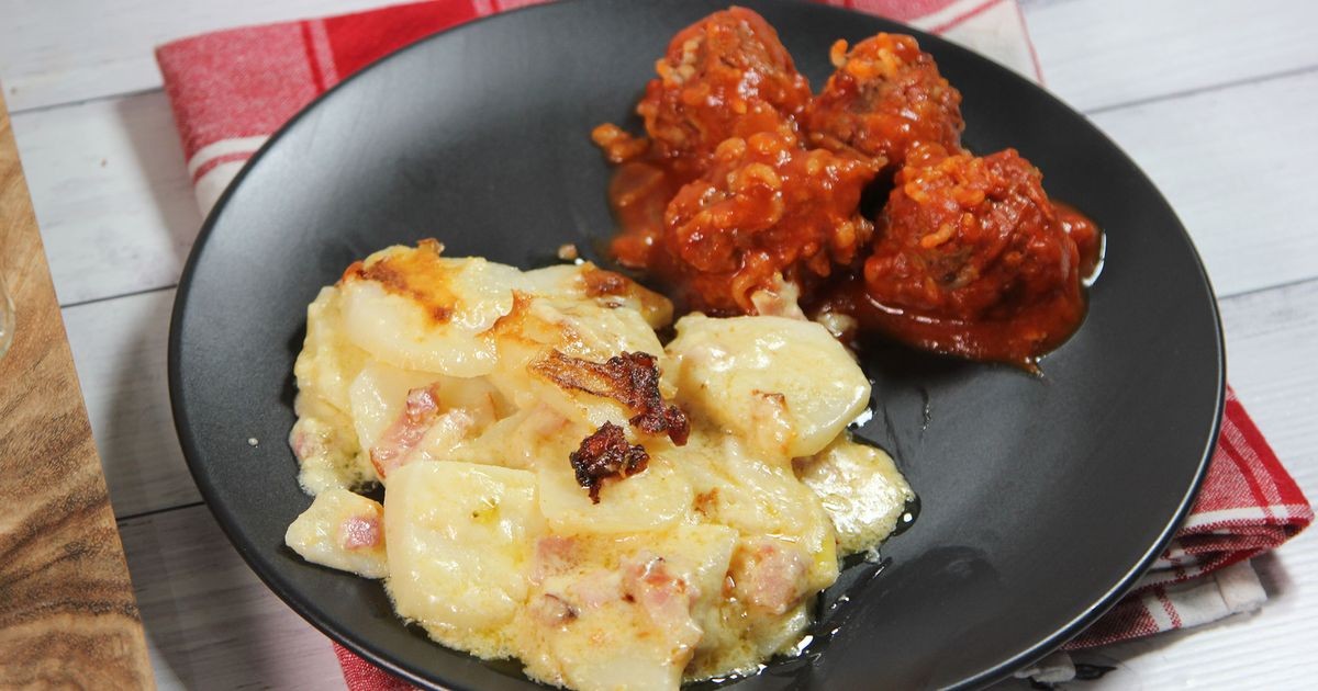 Hornee a 220°C durante 45 minutos, luego nuevamente a 180°C durante 30-40 minutos, hasta que las papas estén tiernas y el queso esté dorado.
