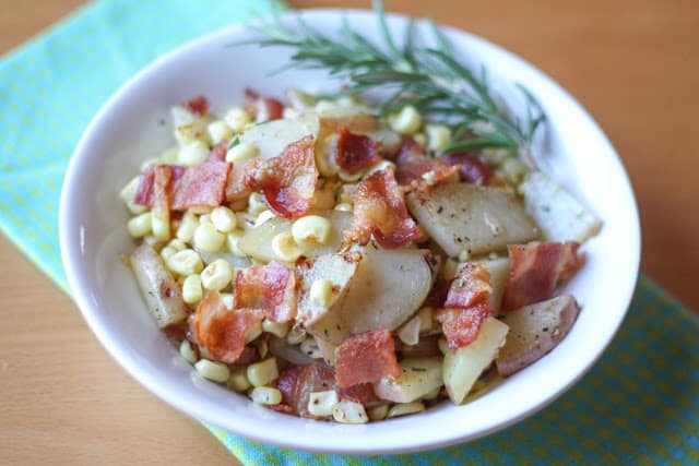 Esta olla de papas al romero con tocino y un plato de maíz fresco fue nuestra cena hace unas noches. Originalmente planeé hacer un poco de pollo para acompañarlo. Sin embargo, sabía igual de bien cuando lo probé; Los niños y yo lo perfeccionamos y lo llamamos cena. Me encantan las comidas fáciles, de un plato como este.